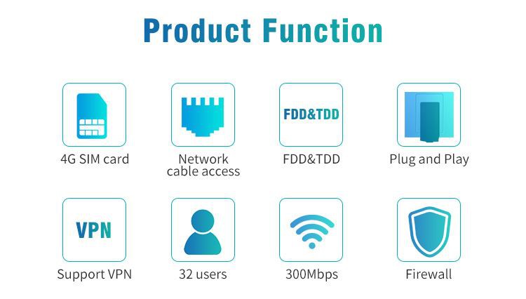 זהו נתב CAT 4 4G WiFi מהירות שידור של עד 300Mbps, מהירות 4G עד 150Mbps, TDD - LTE: 150Mbps DL / 50Mbps UL TD - SCDMA: 2.8Mbps DL22ps / UL. המסוף יכול לתמוך בשלושה מצבי תקשורת: TDD FDD, WCDMA. הוא תומך בגישה לאינטרנט/מצב עבודה PPPoE, משתמש בכרטיס SIM 4G, יכול להתחבר לעבודת מודם כמצב Gateway, מצויד בממשק 4 LAN, עשוי להתחבר למכשירים אחרים בו-זמנית. זה קל לחיבור וקל לנשיאה ביד משתף לקוח ל-32 משתמשי WiFi, פשוט הכנס את כרטיס ה-SIM ואז תוכל ליהנות מ-WiFi עם נתב 4G LTE נייד זה.